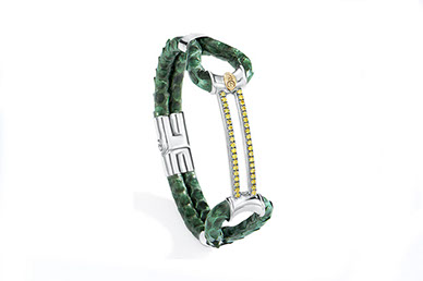 Vibrant, innovative and stylish bracelet made with genuine python leather. Cristian Rubio added a Double row 0.75 carats yellow diamonds, soft leather and a finish in polished gold.