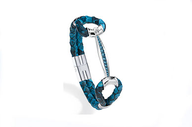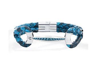 Sophisticated and elegant handcrafted bracelet with a single row of blue diamonds and a finish of polished gold. Get a fashionable look with this unique handmade python strap.