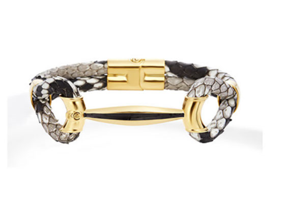 Elegant and daring masterpiece created by Cristian Rubio. This handcrafted embossed python leather double braid put together with specially selected precious metal finish in gold and a bar with hand painted enamel design, gives you a luxurious look.