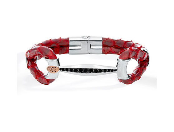 Cristian Rubio describes this piece as a one of a kind red soft python leather bracelet with a single row of black diamonds and a finish in polished gold.
