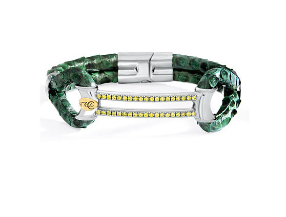 Vibrant, innovative and stylish bracelet made with genuine python leather. Cristian Rubio added a Double row 0.75 carats yellow diamonds, soft leather and a finish in polished gold.