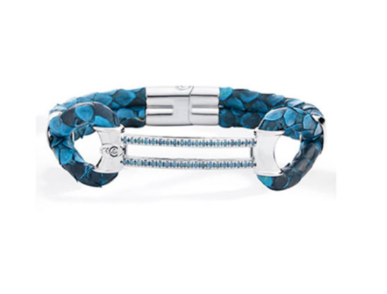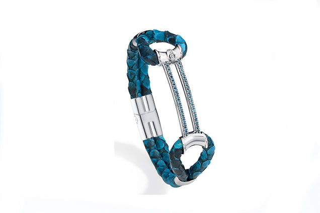 Cristian Rubio made this vibrant and stylish bracelet with genuine python leather, double row of 0.75 carats blue diamonds, soft leather and a finish in polished gold.