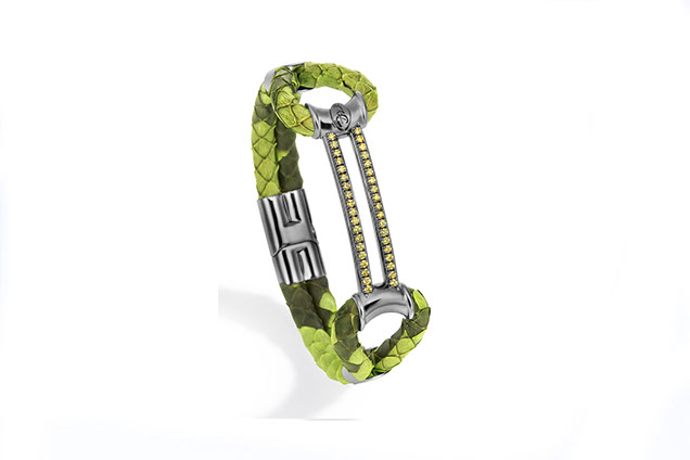 Cristian Rubio designed this masterpiece as a vibrant and eye-catching bracelet with an exotic look. That features genuine python leather, double row of 0.75 carats yellow diamonds and a black Rhodium plating.